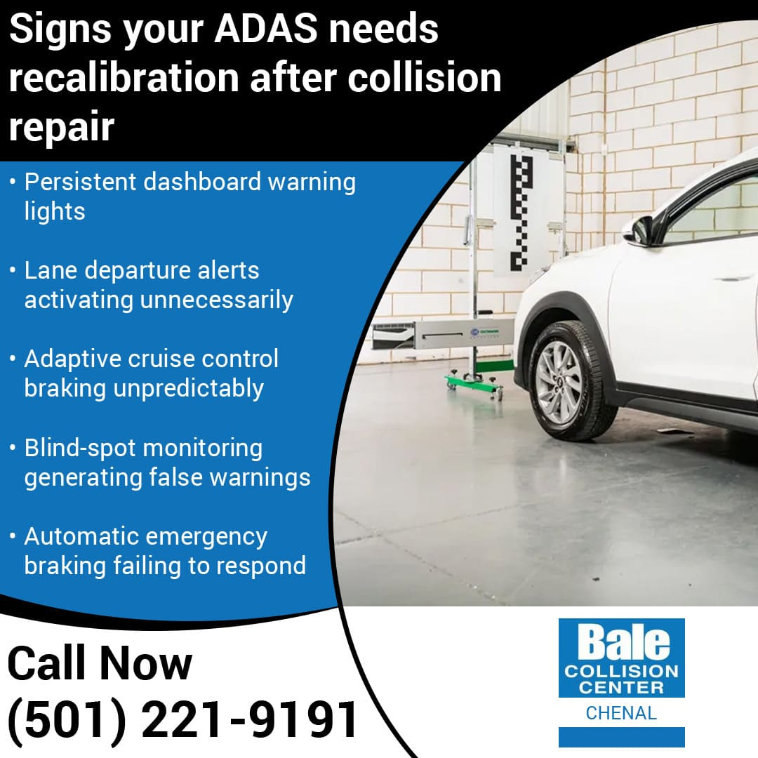Original Source: https://balecollision.com/adas-calibration/little-rock-auto-body-repair-5-common-signs-your-adas-systems-may-not-be-calibrated-correctly/